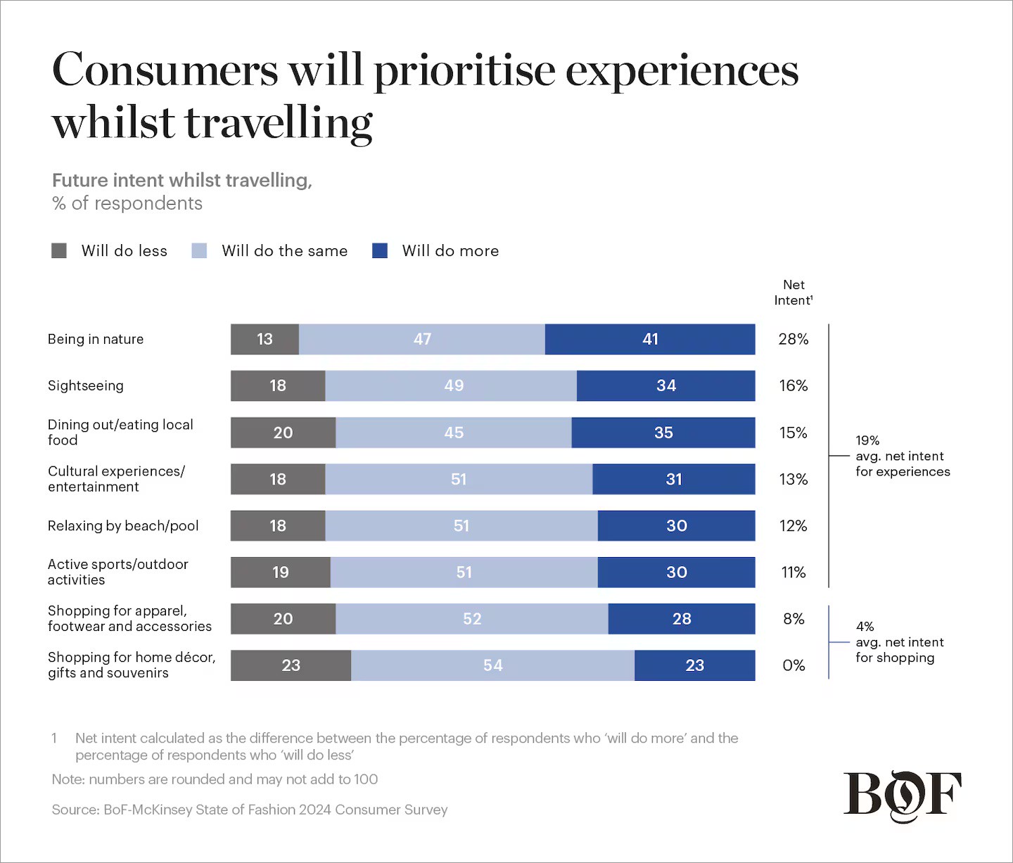 Mua sắm đã trở thành phần không thể thiếu trong mỗi chuyến du lịch. Những tập đoàn xa xỉ hàng đầu như LVMH và Kering công bố rằng khách du lịch, đặc biệt những vị khách Mỹ tại Châu Âu, là nhân tố chính thúc đẩy sự tăng trưởng doanh thu nửa đầu năm 2023. Bên cạnh đó, khảo sát hợp tác giữa BoF và McKinsey năm 2024 cũng chỉ ra rằng 80 phần trăm người tham gia trên toàn cầu có ý định mua sắm quần áo, giày và phụ kiện khi đi du lịch trong một năm tới, với 28 phần trăm dự kiến sẽ chi tiêu nhiều hơn năm ngoái.
