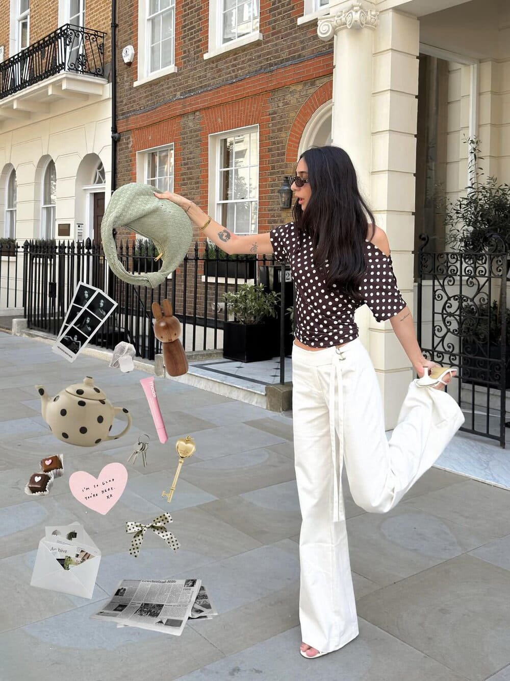 Những bức ảnh sắp xếp gọn gàng kiểu cũ đã trở nên “lỗi thời”, giờ đây cách chụp thịnh hành là tạo cảm giác như mọi thứ trong túi được trút ra ngoài. Không phải thật sự ném đồ xuống đất, mà nhờ kỹ thuật, người ta thêm vào khung hình những sticker như hình nước hoa, son môi, kính râm, máy ảnh, tai nghe, đồ ăn vặt... Kết hợp với dáng pose sinh động của nhân vật, trông như thể đồ đạc từ túi rơi xuống, vừa tinh nghịch vừa đáng yêu.