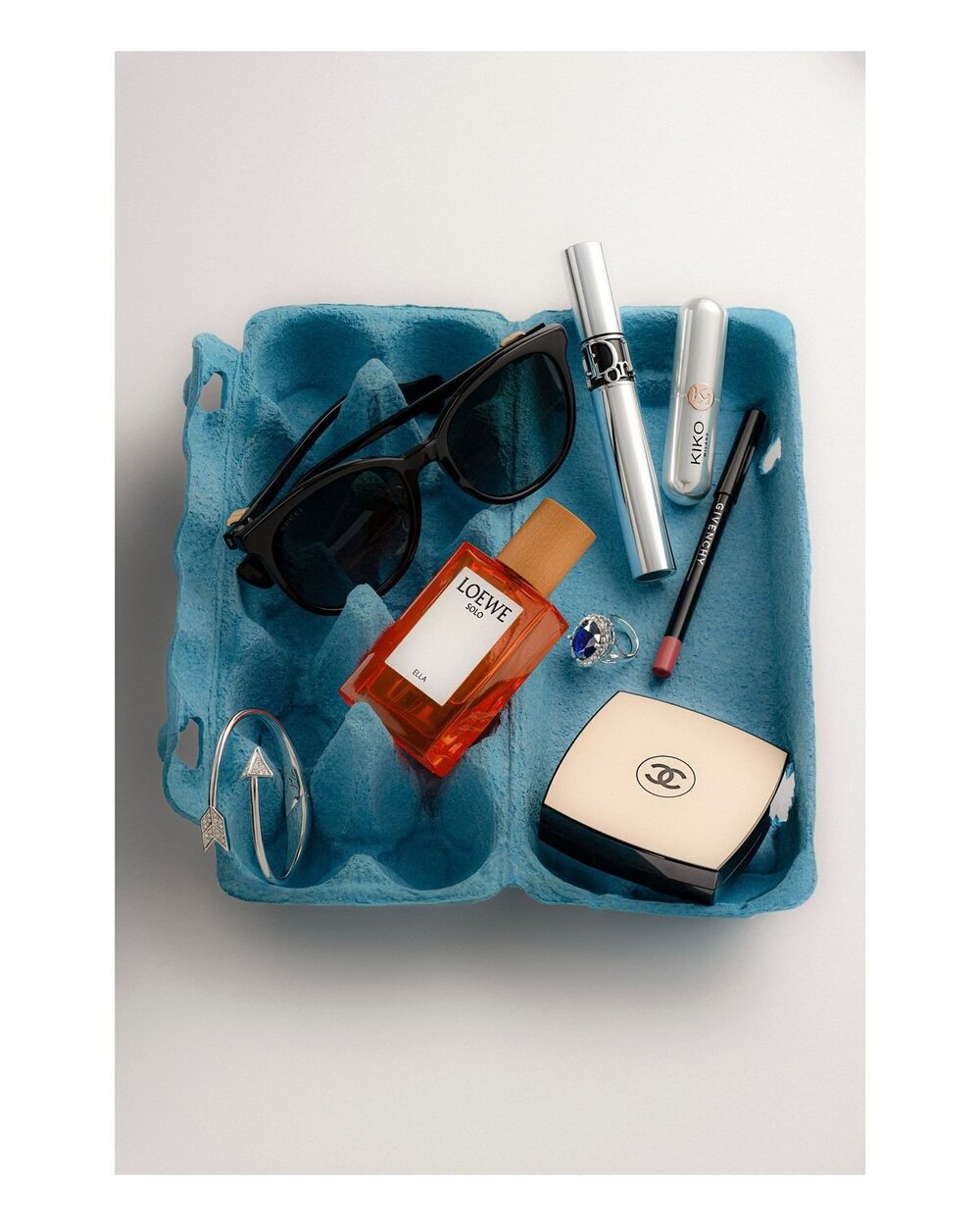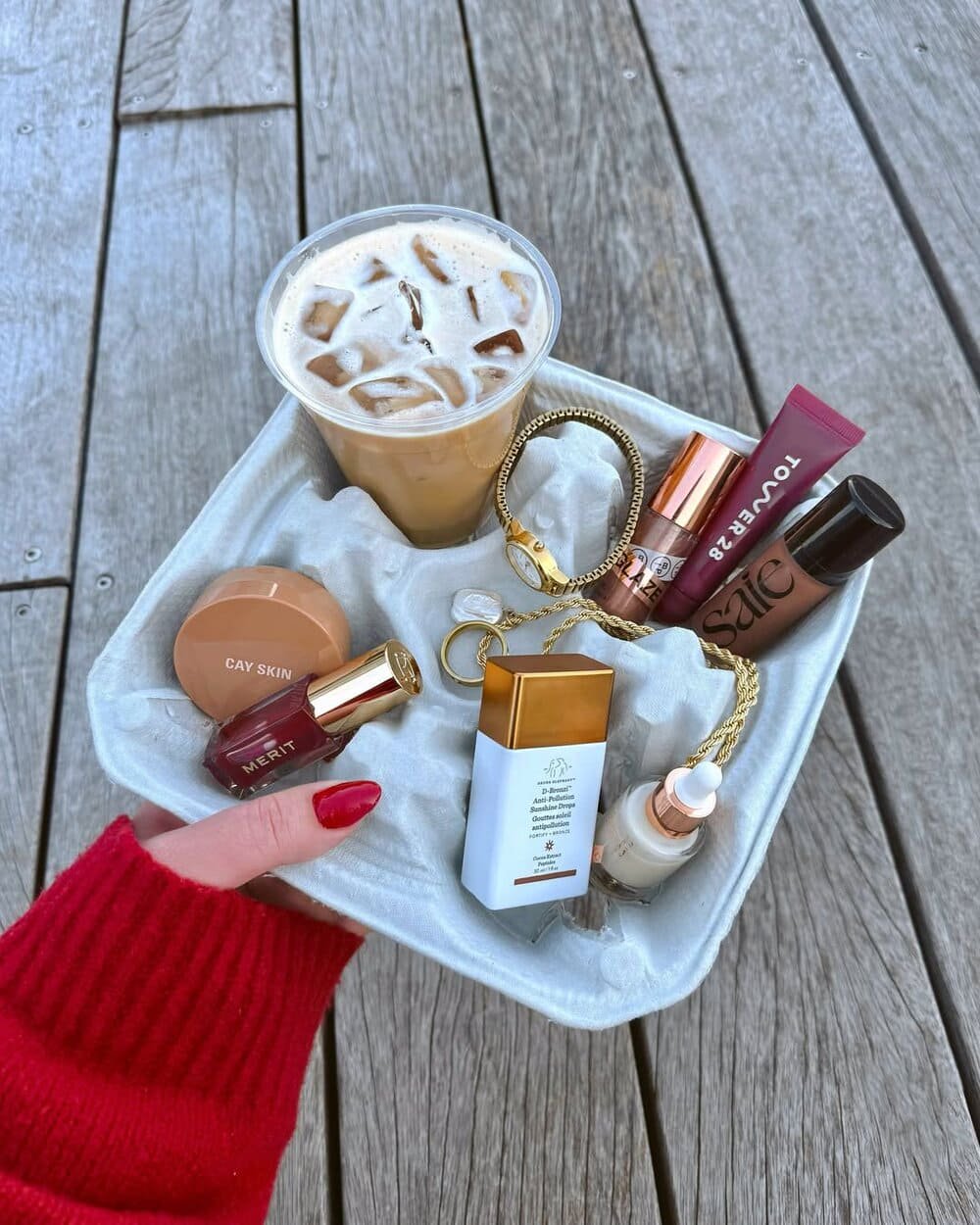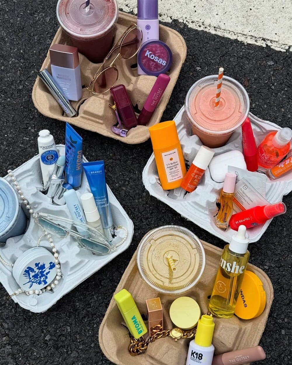 Một trào lưu chụp ảnh khác chính là Coffee tray trend: tận dụng khay giấy thường thấy khi mua cà phê mang đi, đặt lên đó một ly đồ uống rồi xếp thêm đủ loại mỹ phẩm như son môi, thỏi dưỡng ẩm, serum, nước hoa… thậm chí cả những món đồ chơi nhỏ xinh. Nếu cầu kỳ hơn, bạn có thể chọn các món đồ cùng tông màu để khi chụp lên, bức ảnh trông tinh tế và đẹp mắt hơn.
